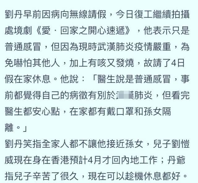 最近,资深演员刘丹(丹爷,刘恺威父亲)患上了重感冒,没有办法按照正常进度拍戏,需要请假在家养病,没能参与TVB情景喜剧《爱·回家之开心速递》的拍摄工