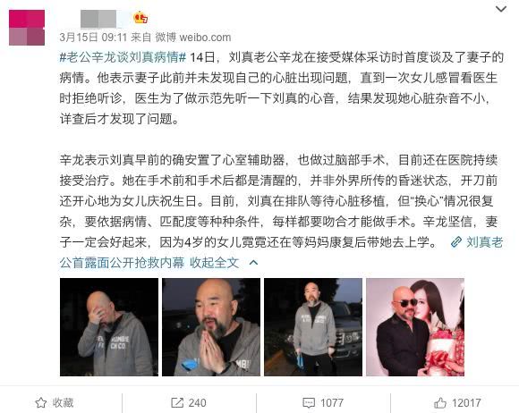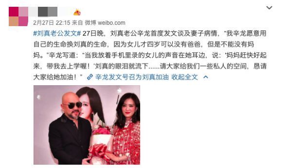 随后刘真老公辛龙发文谈到妻子病情,表示愿意用自己的生命去交换刘真的生命。