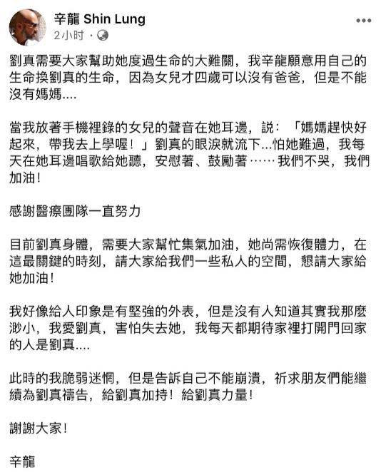 刘真手术失败后,辛龙曾发过一条动态说:女儿才四岁,不能没有妈妈,但可以没有爸爸,他愿意替刘真去死。