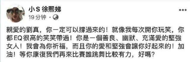 刘真患病期间,小S也一直为她加油打气:等你康复我们再来比赛谁跳舞比较有力,好吗?
