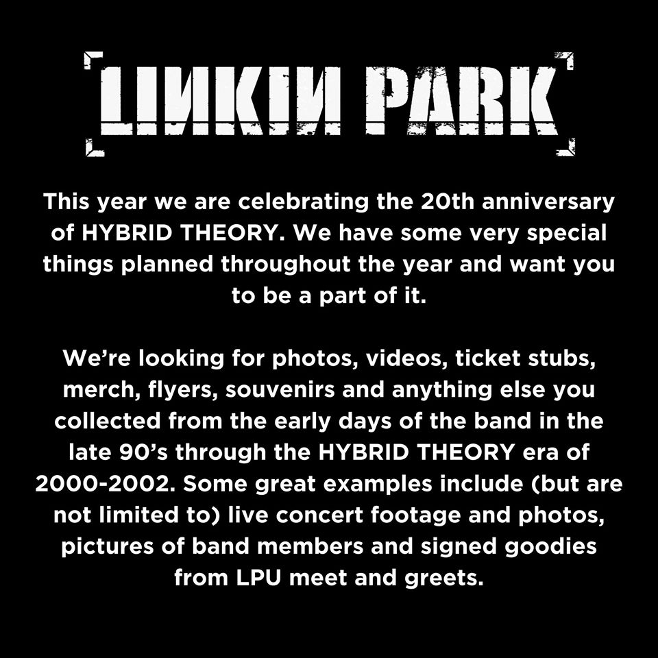 此前林肯公园表示,今年他们为纪念首张专辑《Hybrid Theory》发行20周年,将开启全年特别计划,目前正在向观众征集乐队以往珍贵的照片、视频、票根、传单、纪念品,以及乐迷从上世纪90年代末到《Hybrid Theory》专辑发行时期,以及2000-2002年乐队现场镜头和成员的照片、签名礼物。
