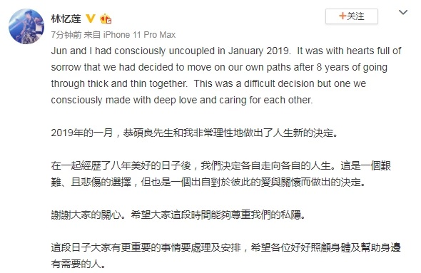 不过,林忆莲与恭硕良已经出了声明,透露两人是和平分手,还祝福对方有更好的未来,不像是撕破脸的样子。