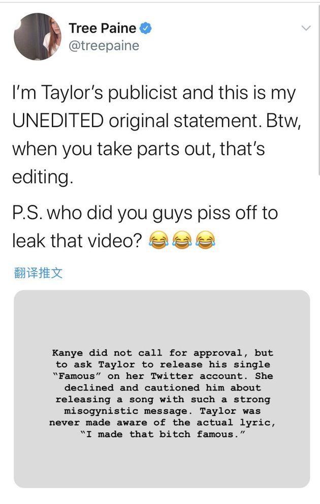 对此,霉霉的公关经理“树姨”Tree Pine在个人社交网站上发文回应,“我是Taylor的公关人员,这是我未编辑的原始声明。顺便说一句,当你截取视频片段,就是在编辑。”