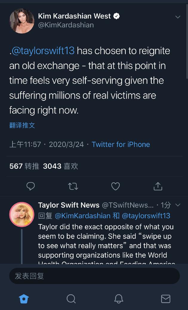 据外媒报道,3月24日,金·卡戴珊(Kim Kardashian)在个人社交网站发文。称霉霉Taylor Swift仍然在扮演受害者,并利用电话录音做假慈善。