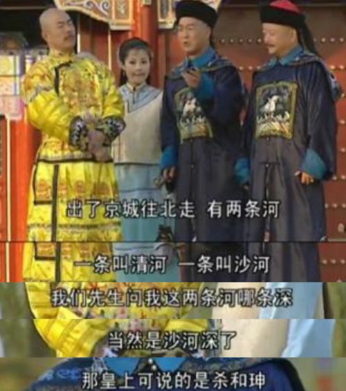 更精妙的设计是,这一幕发生时,纪晓岚还特地对一旁年幼的嘉庆说:“十五阿哥你记住,皇上说沙河深”。