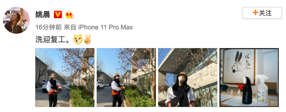 " 3月23日,姚晨晒照喜迎复工 ,并大玩谐音梗发文道:“洗迎复工"照片中姚晨戴着口罩和渔夫帽,装扮休闲,拿着水管为公司前的树丛浇水,心情大好。"姚晨晒照喜迎复工。"姚晨发文庆复工。"姚晨发文庆复工。141微信扫一扫复制下方链接,去粘贴给好友吧-姚晨玩谐音梗喜迎复工 戴口罩为植物浇水心情好复制链接本文由网络整理 © 版权归原作者所有