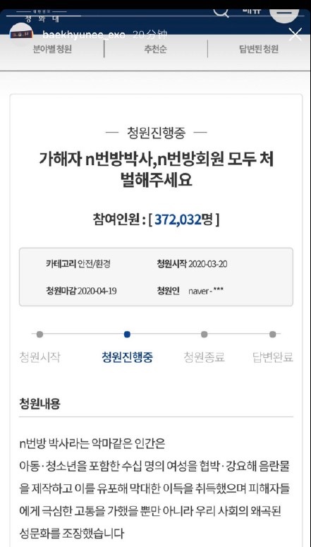 边伯贤在社交网站发布了一张他参与青瓦台请愿的截图,而他参与的请愿正是要求政府公开“N号房”事件所有涉案人员的身份并惩处聊天室26万名会员的请愿。除了边伯贤以外,河妍秀、孙秀贤等众多韩国艺人也参与了该请愿,请愿参与总人数已经突破了420万名。