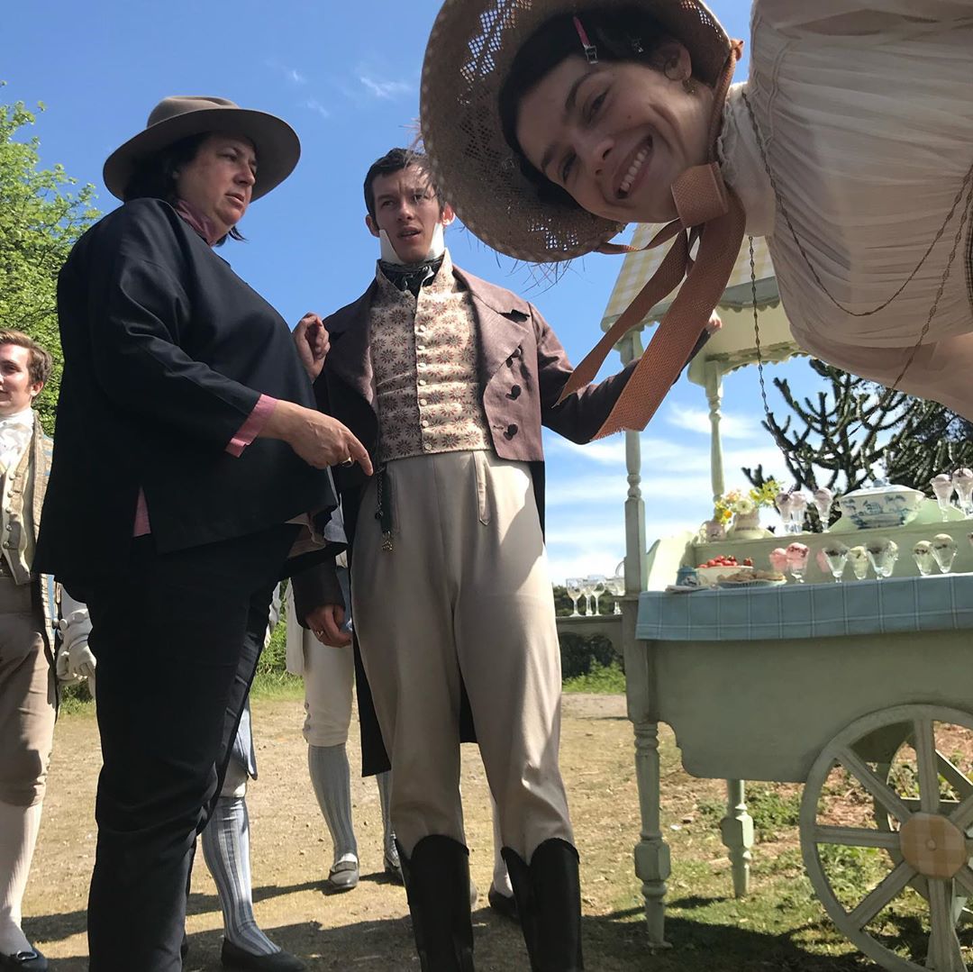 女导演奥特姆·代·怀尔德(图左)在影片《爱玛》拍摄现场。