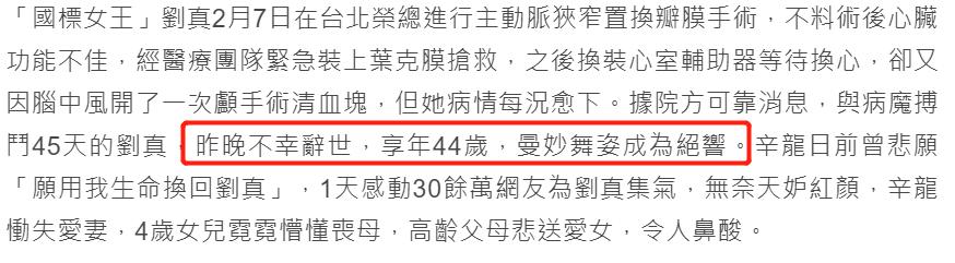 3月22日,据台媒报道,“国标女王”刘真在抢救了45天后,还没等到心脏移植手术,就不幸身亡,享年44岁,再也看不到她曼妙的舞姿,令人惋