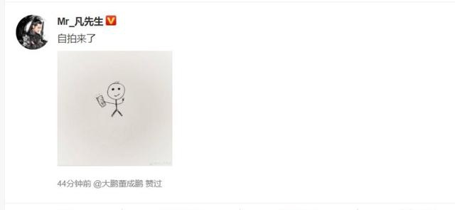 3月22日,吴亦凡在微博上晒出一张“自拍照”,并且配文:自拍来了。不过这张“自拍照”却略显潦草,因为这并不是用手机或者相机拍出来的,而是吴亦凡用简笔画画出来的,“自拍照”中一个小人拿着手机自拍,发型也很独特。