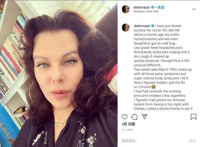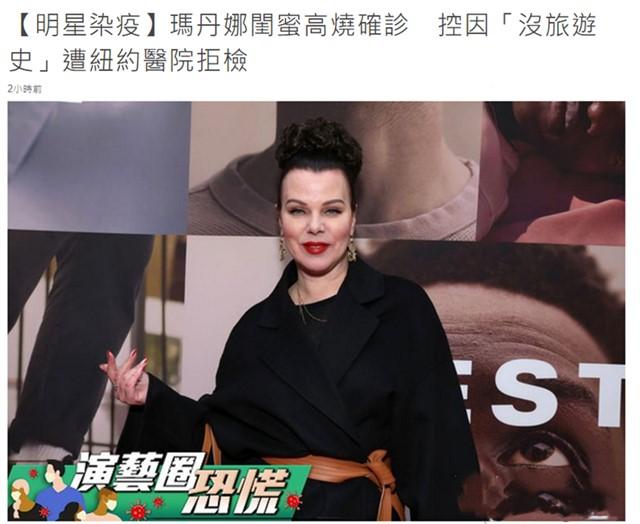 好莱坞演员黛比玛扎在网上自曝确诊新冠肺炎,她表示自己早前开始发烧并且全身疼痛、头痛、喉咙痛等症状,原本纽约医院因她不符合资格不让她筛检,直到上周日友人告诉她社区的紧急治疗中心有检测套组,她检验5天后报告出炉呈阳性反应。