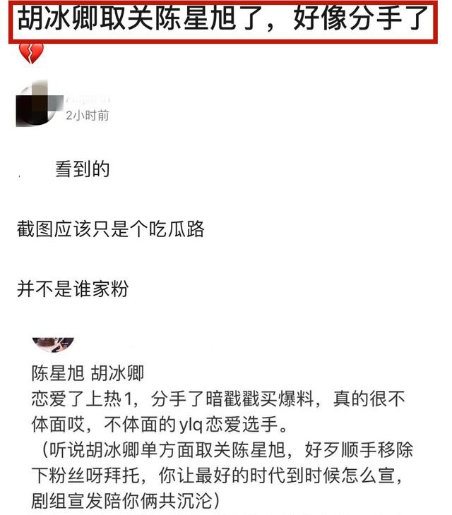 突然被曝光的陈星旭和胡冰卿的恋情平地一声雷,让剧粉、cp粉们的"房子"炸开了花。然而这段曝光不到6个月恋情疑似出现变故,有网友发现胡冰卿的社交账号单方面的取关了陈星旭,猜测两人疑似分手。