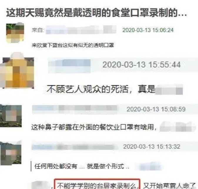 在节目中,表演者与嘉宾均戴着透明的食堂常用口罩,此类口罩并未形成良好的密封效果,仅能在一定程度上阻挡佩戴者说话时产生的飞沫。不少网友对此质疑戴这种口罩是否有效,担心艺人的安危,还吐槽道“不能学别的台居家录制么”。