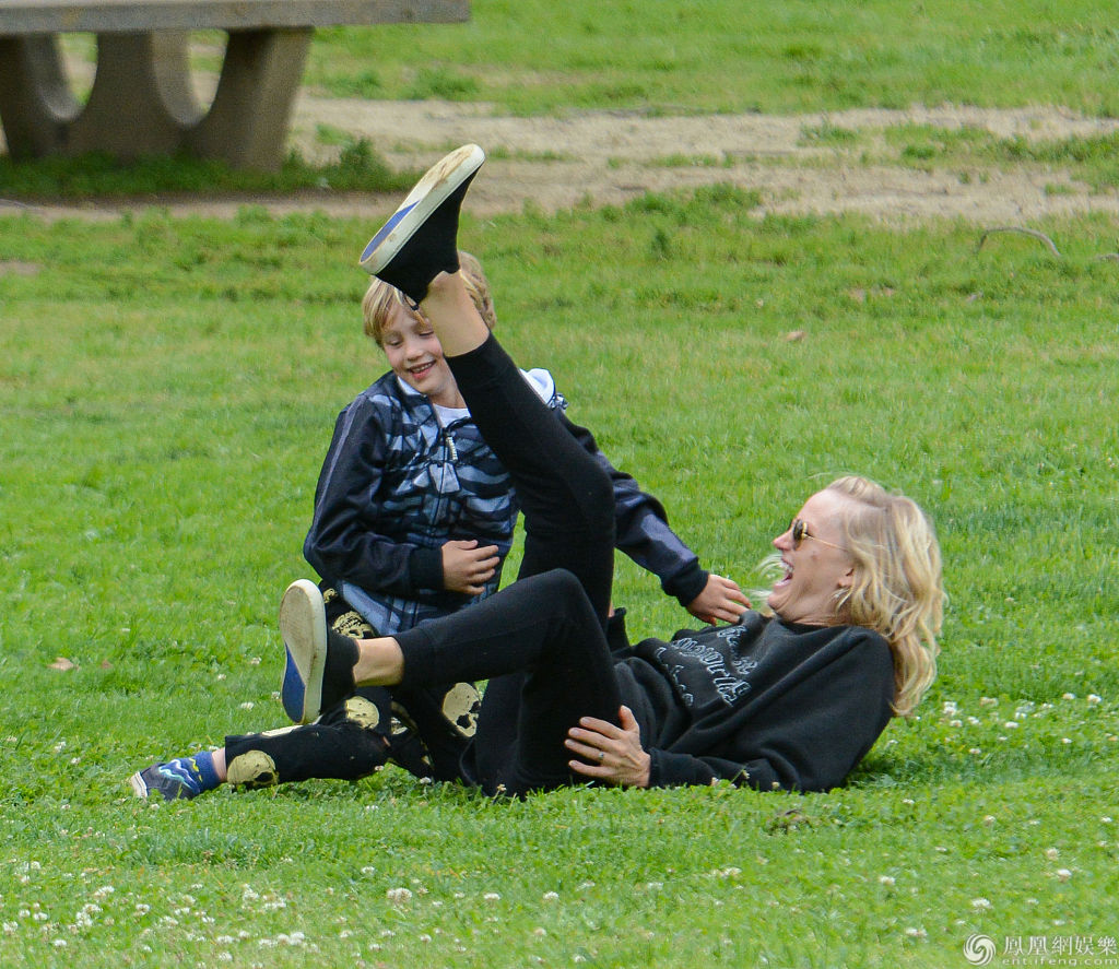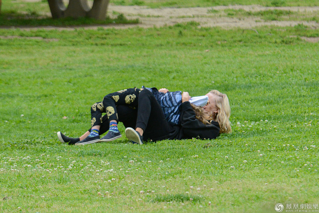 玛琳·阿克曼面戴墨镜,躺在草坪上与孩子玩耍,尽享温馨时光。
