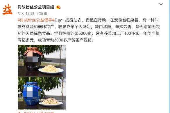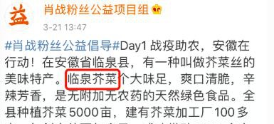 肖战粉丝公益项目组发博称在安徽省临泉县有一种特色美食,为了战疫助农,把这些美食的把这款特色美食卖出去,晚上将会在某平台直播卖货。