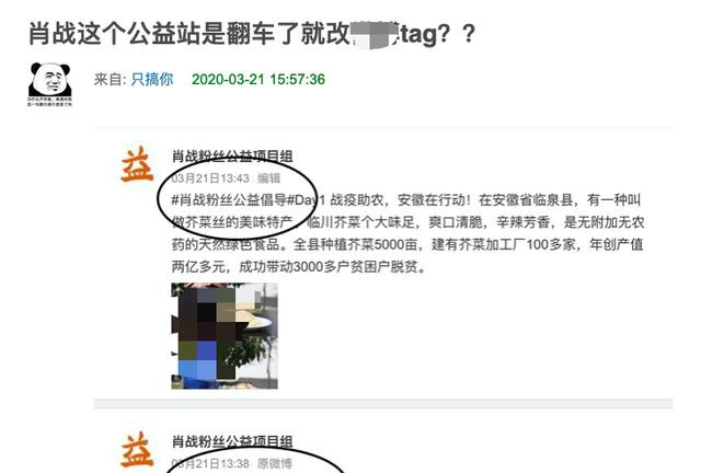 你以为这就完了吗?没有,之后有网友发现这个战役助农的项目实际上并不是由肖战团队发起的。而这条打广告的博文却明晃晃写着“肖战粉丝公益项目”,过了几分钟才改成“肖战粉丝公益倡导”。