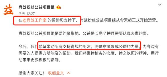 3月21日,肖战粉丝宣布在肖战工作室的帮助和支持下,正式开始运营肖战粉丝公益项目组 ,旨在为身边有需要的人提供力所能及的帮助。