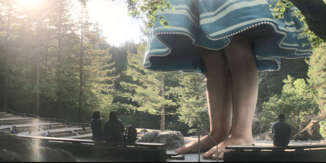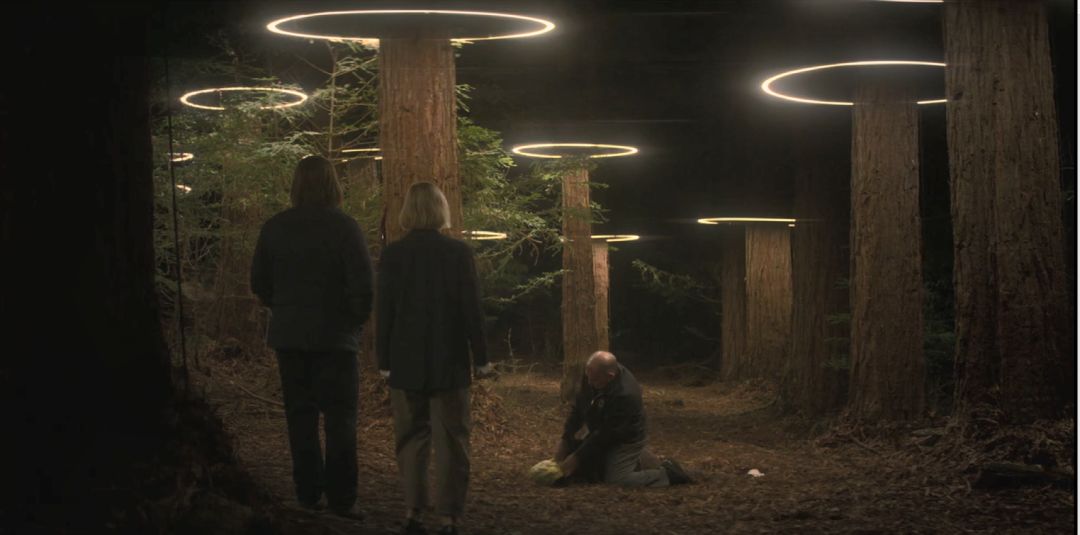 剧中的阿玛雅园区就是一个冰冷而诡异的视觉奇观,从最突出的特征开始:一个巨大的女孩雕像,头高昂着,好奇的目光笼罩在树梢之上,再往下走,是一片茂密的树林,林中的树木在黑夜里变成巨大的荧光灯,像一朵朵迷幻的蘑菇。