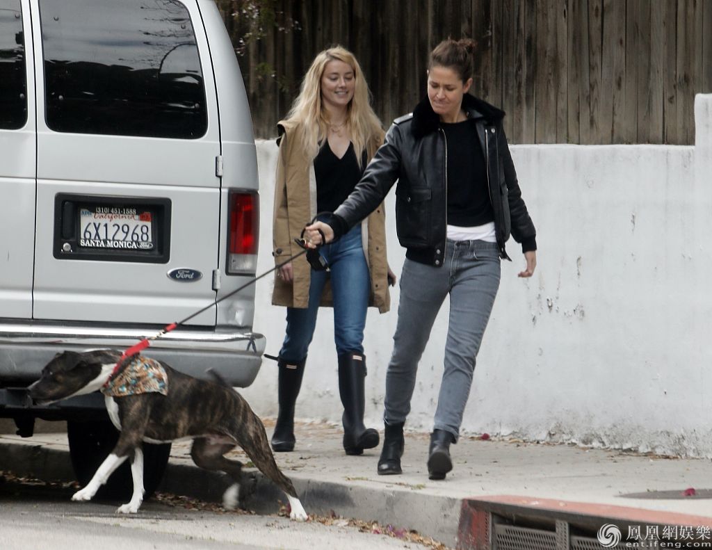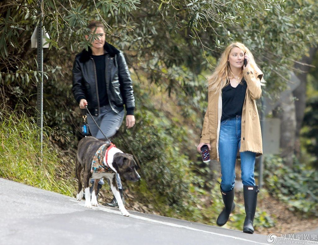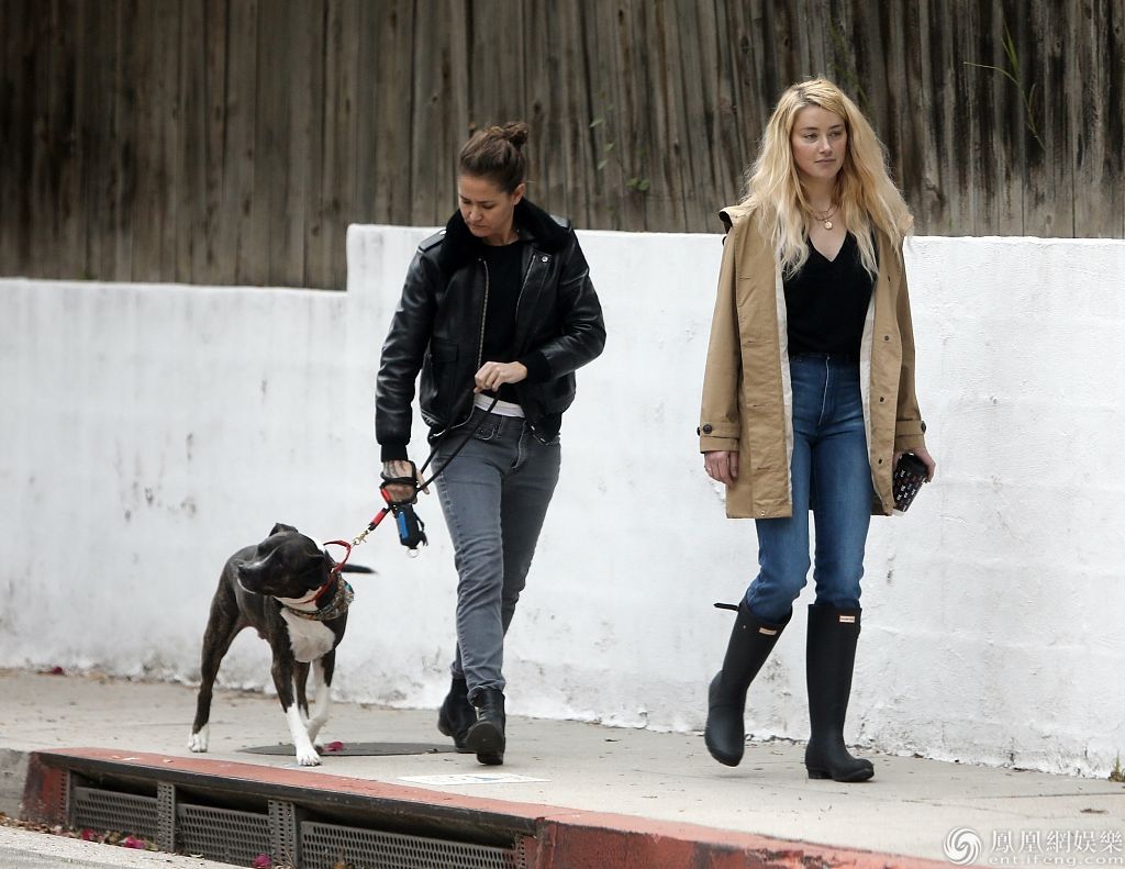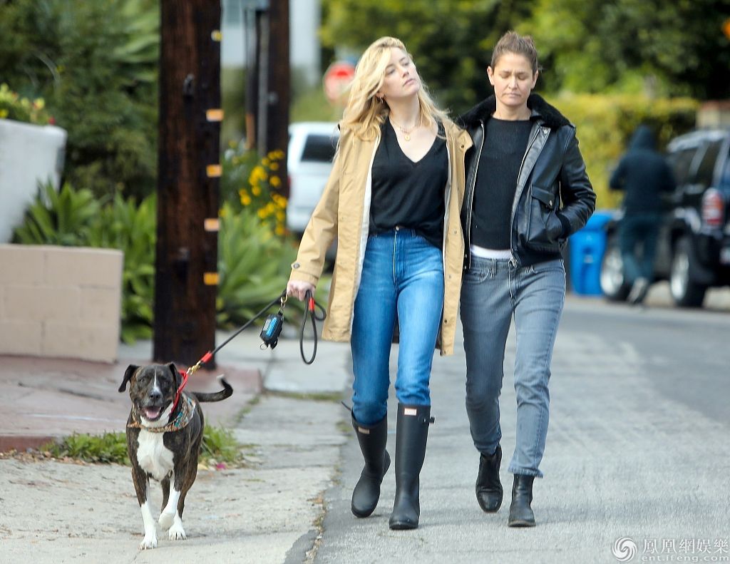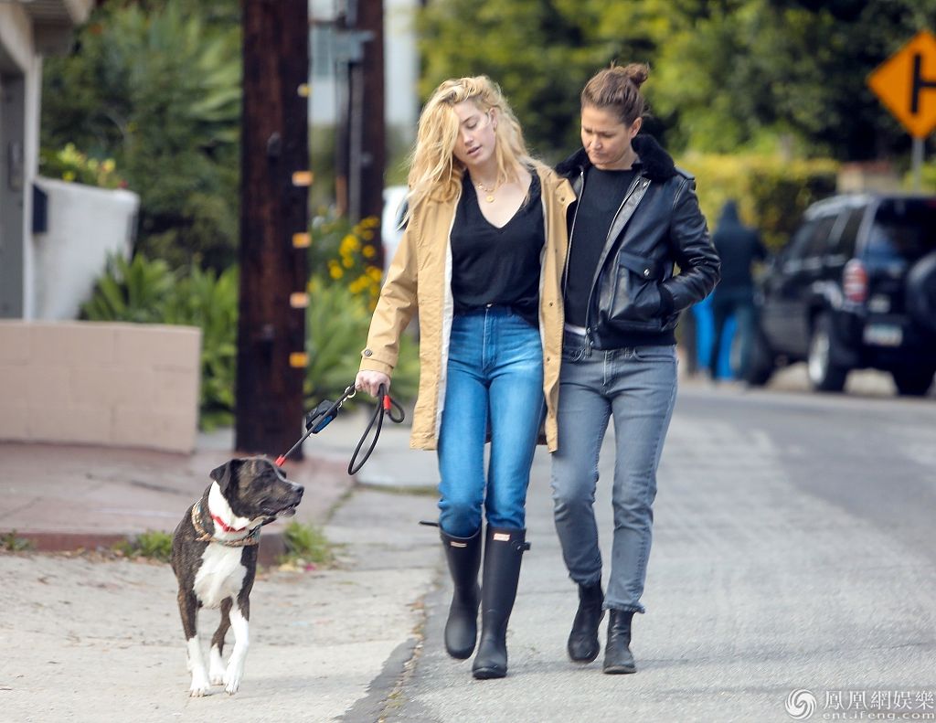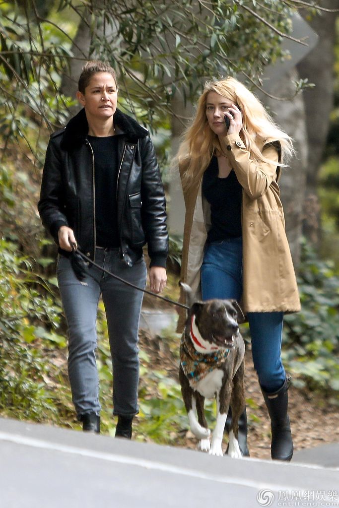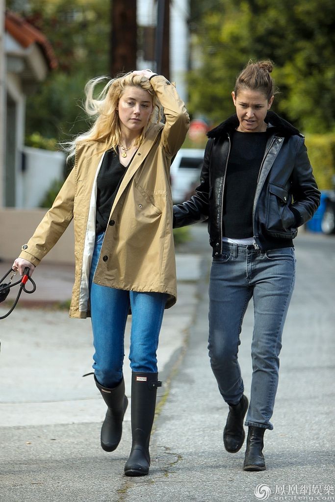 艾梅伯披头散发面容显憔悴,装扮时尚,一路忙打电话,获女友搀扶陪伴遛狗散心。