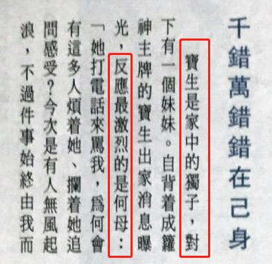 最后一种说法是他因为从小就与佛结缘,更有妈妈的引导。后来在拍摄吕颂贤版的《笑傲江湖》时,遇上了饰演“岳不群”的王伟点化。之后何宝生和好友去拜会一个出家人,那时候就好像想通了人生的道理。