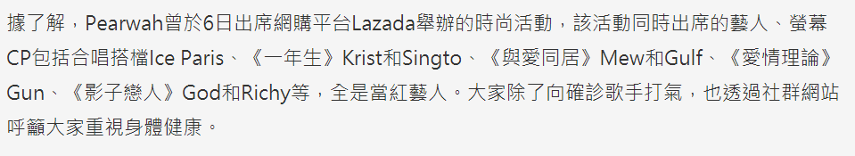 而不幸的是,Pearwah这些天来,出席了不少的活动,接触的人也是不少,其中在6日还出席了一场大型时尚活动,其中就包含了泰国多位男神。