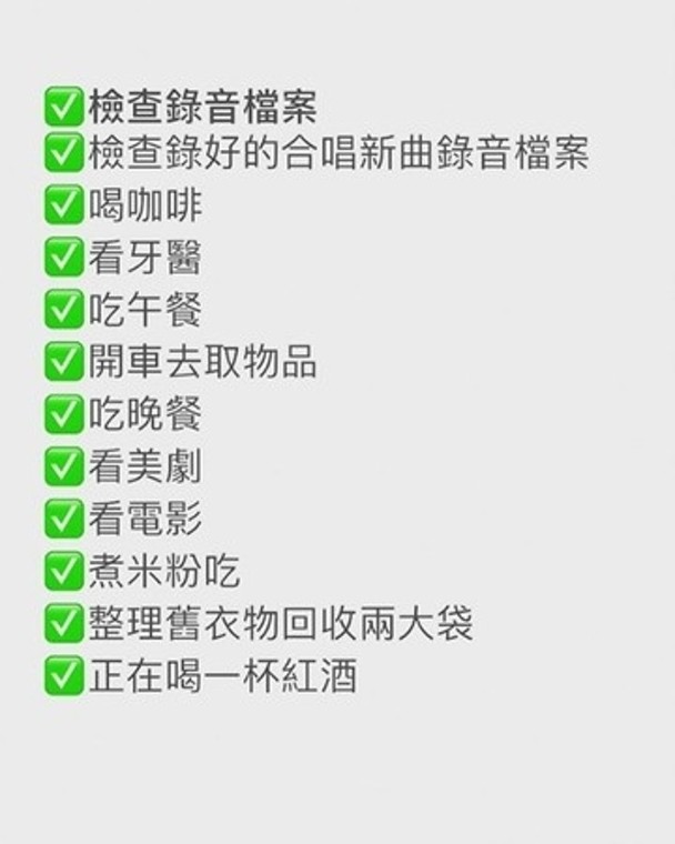 据台媒报道,歌手梁静茹与前夫赵元同于2019年年底离婚,结束9年婚姻.现在单身的她,似乎已走出阴霾,更于社交网与粉丝分享她的生活、行程.梁静茹亦已开始有工作上的新计划,令歌迷都相当兴奋。近日,梁静茹于社交网晒出自己一天的行程,当中包括检查录音档案、喝咖啡、开车去取物品、看美剧及电影、煮米粉吃,从这些生活轶事看来,她已重回正常的工作及生活轨道。