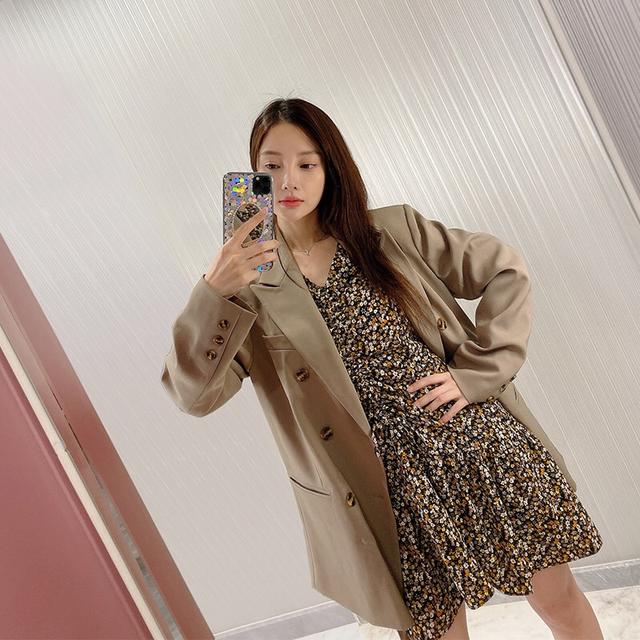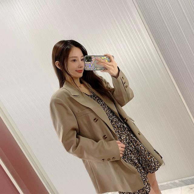 穿上碎花裙后,再搭配小西装,左手拿手机自拍,右手叉腰,穿着高跟鞋,凸显大长腿。李小璐肤白貌美,团队再专业的P图,完美凸出好身材。