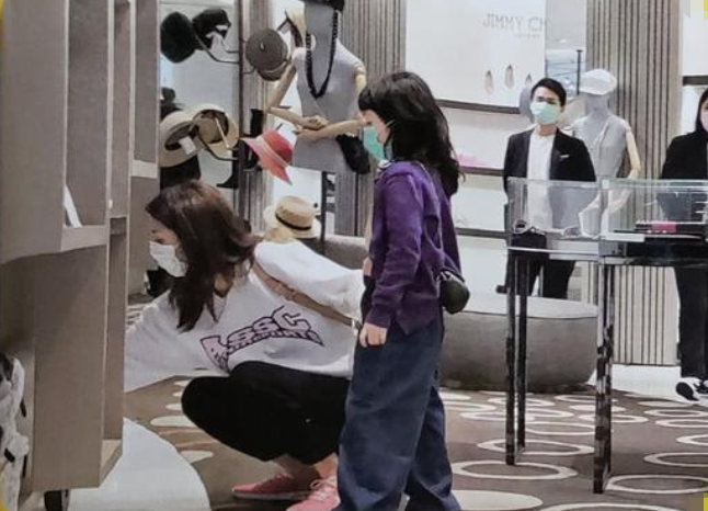 在电梯上,洪欣还给女儿系鞋带,十分的贴心。