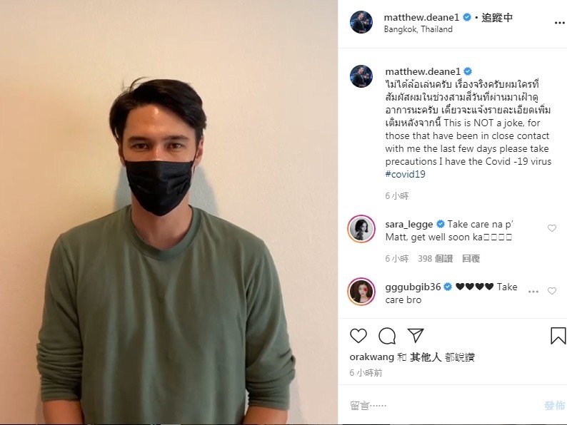 此前,13日,41岁泰国男主持人马修·迪安(Matthew Deane Chanthavanij)公布确诊新冠肺炎的消息,他同时也是泰国娱乐圈第一位感染新冠病毒的艺人。他拍下视频,称“这不是开玩笑的”,同时请曾经和自己密切接触过的人注意自身健康。