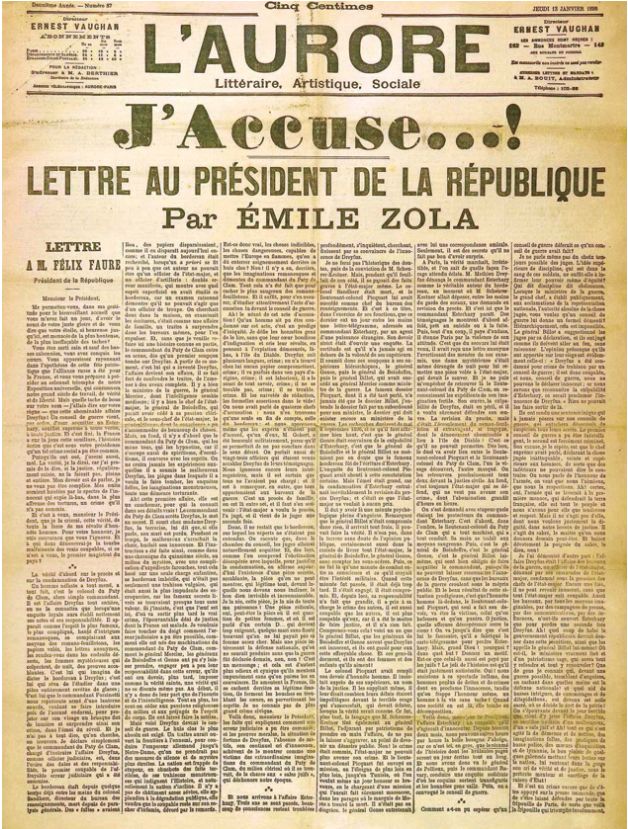 大文豪左拉以这些材料为基础,写就了一封致共和国总统的万言信,全篇洋洋洒洒、笔力雄浑、激情澎湃,实为檄文,控诉了笔迹鉴定学家、八位陆军将领、逾矩的法庭以至于整个腐朽无能的军部,名为“我控诉”,刊登于《震旦报》。