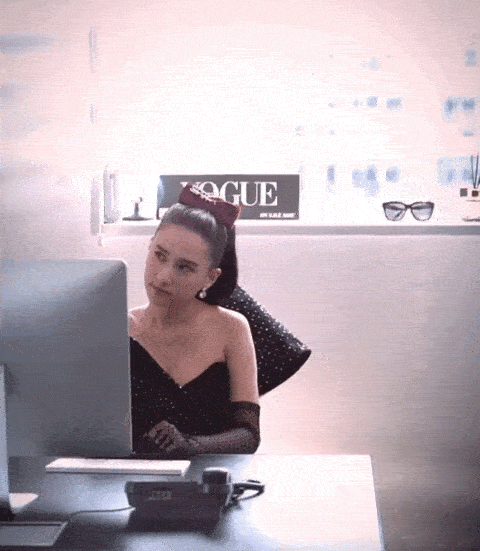 何超莲顶着“时尚女魔头”的造型,却做着办公室小妹的工作,却由于她的少女感,画风竟然也十分和谐,每一个表情都非常可爱。