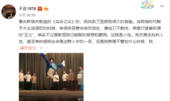 此次发布的长文末尾处,于正不忘安利了即将播出的电视剧《鬓边不是海棠红》,还自侃道:“至于我,太不重要了,鸡蛋好吃就行,管他母鸡丑不丑,对不?”