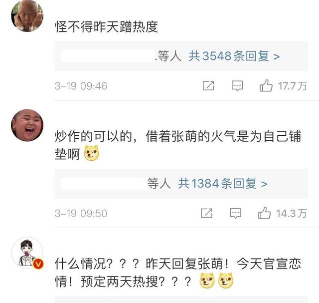 两人官宣恋情后,引来不少网友围观。他们表示:“怪不得昨天蹭热度”、“炒作可以呀,借着张萌的火气是为自己做铺垫啊”、“什么情况?昨天回复张萌,今天官宣恋情?预定两个热搜?”.....