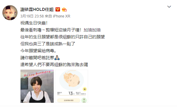 动态曝光后,网友们纷纷为谢依霖送上生日祝福:“生日快乐啊,小hold”,还有网友调侃道:“生日快乐呦阿hold!这一胎怎么还瘦了呢?”