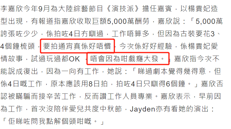 在出席活动时,李嘉欣分享到,这次拍摄虽然工作不算多,但是因为古装造型要花3、4个小时梳头,所以经常导致要通宵拍摄,导致4天才睡了6个小时,这点就让许久没有拍戏的李嘉欣很不习惯。至于网传拍戏收了5000万传闻,她更是予以否认,称太夸张了。