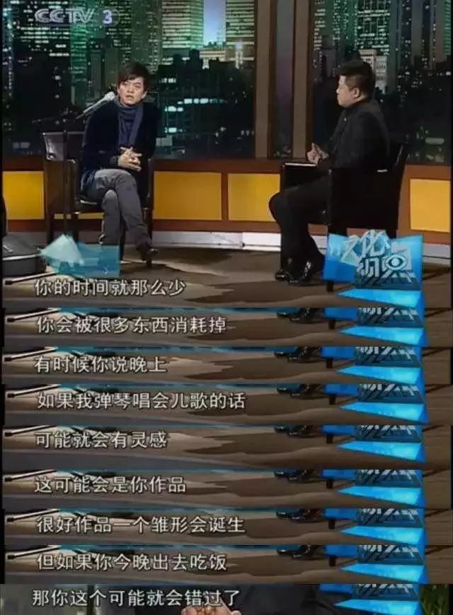 “你的时间就那么少,你会被很多东西消耗掉,有时候你说晚上,如果我弹琴唱会儿歌的话,可能就会有灵感,这可能会是你很好作品的雏形。但如果你今晚出去吃饭,那你可能就会错过机会了。”