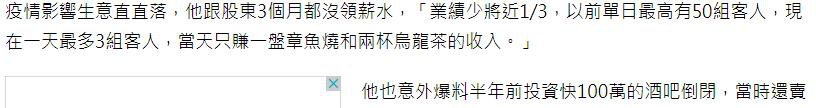在这次采访中,梦多表示之前有和朋友一起投资了一家餐饮店面,地址选在中山区,花费了150万台币(人民币34万元),刚开始的生意其实还算不错,但是随着过年前后的疫情影响,每天的生意急转直下。