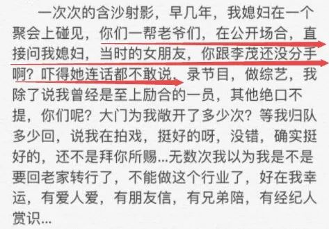 4、早几年李茂老婆弦子出席活动被他们逼问,怎么还不分手?弦子被吓得不敢说话。