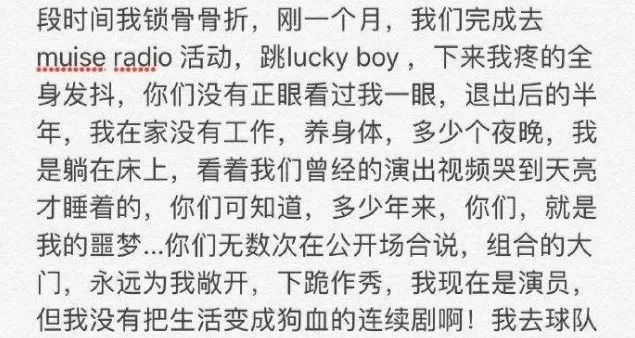 还有就是自己锁骨骨折还坚持舞台唱跳,下来之后疼的直发抖,团员没人正眼瞧过他一下,完全没有组合情谊。