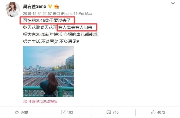 小五和吴宥萱的故事到后面就没有很详细的内容了,只是在2019年最后一天的时候,吴宥萱发微博表示2019是可怕的一年,有人离去有人归来,大有一种与过去告别的架势。