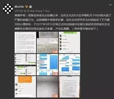 不过这些八卦没有人在意,事情就这么过去了。到了17年5月17日,刘洲成的妻子林苗突然在微博发布离婚声明,控诉刘洲成先后6次在孕期和月子内对其实施了严重的家暴行为,对其身心造成不可磨灭的伤害。