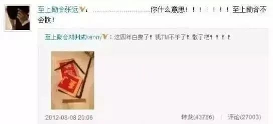 后来15年12月,张远发微博说“一个人唱歌很紧张兴奋,不过明天组合发新歌”,刘洲成直接转发,暗讽张远想要单飞。后来张远努力圆话,刘洲成还继续酸:“反正走了两个了嘛,也不差你一个。”