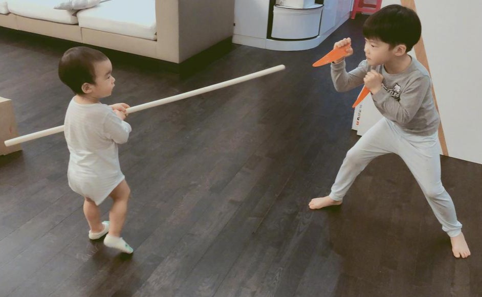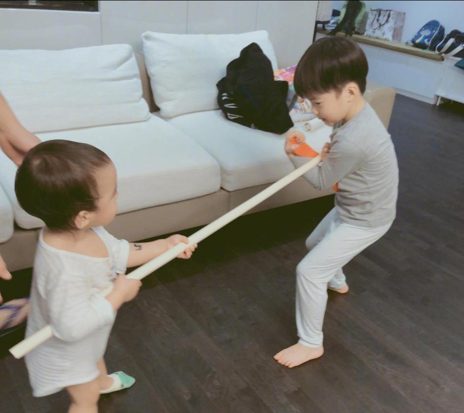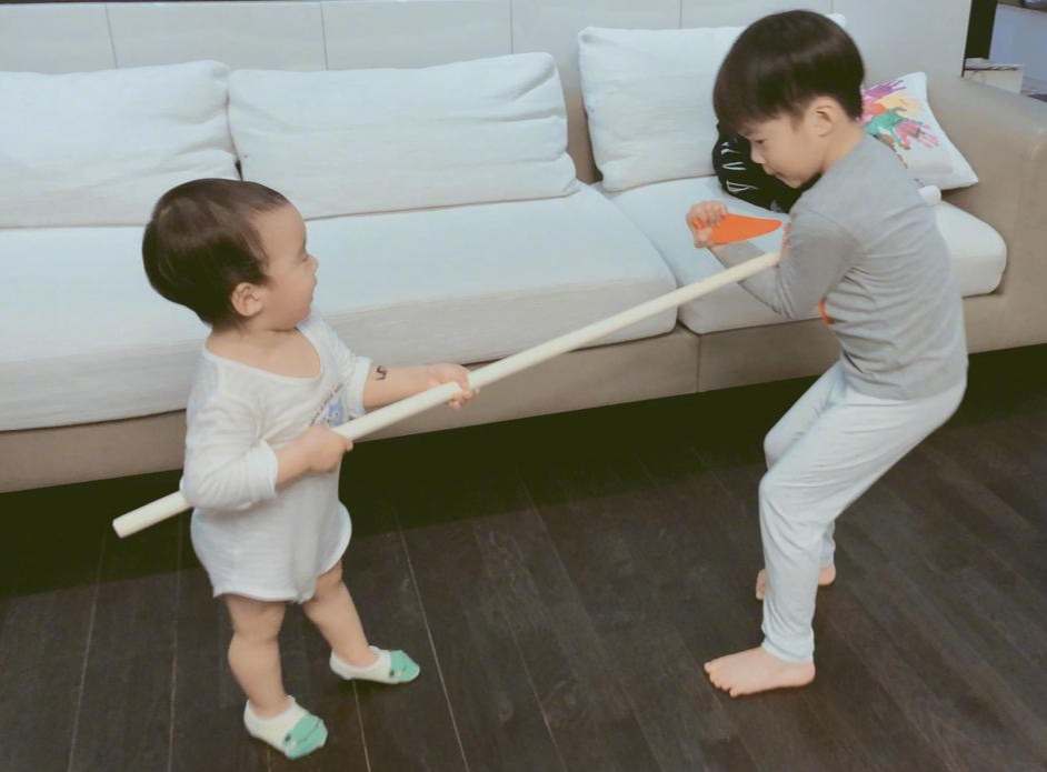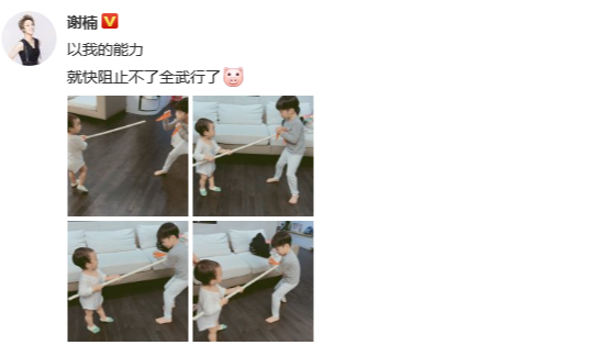 19日晚,谢楠晒出两个儿子“打架”的照片,写道“以我的能力就快阻止不了全武行了