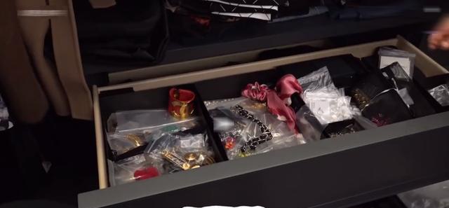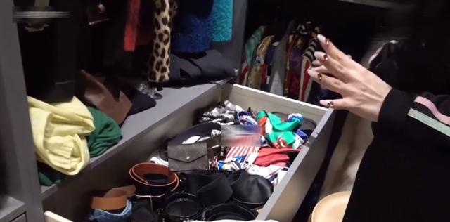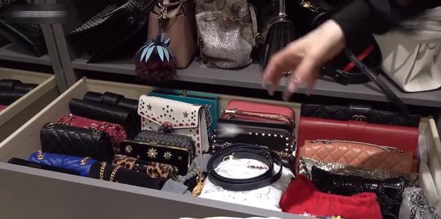 摆放包包的柜台下方有很多大抽屉,一些抽屉里是体积较小的包,还有一些抽屉里则放有丝袜、丝巾、围巾和其他配饰。丝巾就算韩艺瑟从来不戴还是会囤很多,因为觉得漂亮。至于丝袜,则是因为她手指甲较长,很容易刮破丝袜,所以也备了多条。