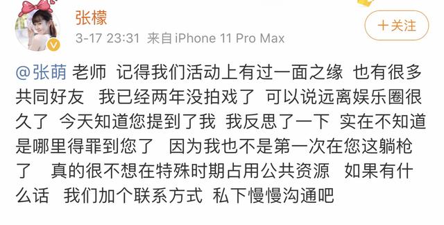 这个简短的互动却像蝴蝶效应的翅膀,在网络上发展得格外迅速。作为“被当事人”的张檬自然也很快的知道了,当晚张檬主动发微博@张萌并直接询问,从措辞当中不难看出,她心中对于张萌给在虎扑上给网友的作答感到了不满,还提问张萌:“我反思了一下 实在不知道哪里得罪您了”。