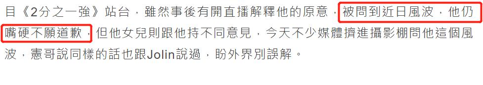 3月19日,吴宗宪卷入“忧郁症就是不满足”风波后,受邀到女儿Sandy的节目做客,再次被提及近日的风波,他仍旧嘴硬不肯道歉,甚至翻出10年前的旧账,拉Jolin蔡依林下水,引发热
