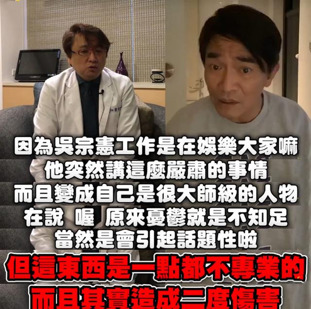 近日,吴宗宪在综艺节目中,对来宾李明川表示:“你干嘛忧郁症呢?忧郁症的原因都是这三个字—不知足!”引起网友争议。