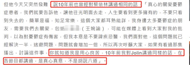 吴宗宪说自己在10年前也曾经对蔡依林讲过相同的话,间接暴露了天后蔡依林疑似曾患上忧郁症。他坚持自己的意见,并表示自己是用心良苦,是真心关爱忧郁症患者,不是胡说八道。