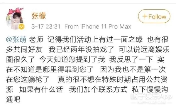 “张萌老师...我们在活动上有过一面之缘....也有很多共同好友...我都快远离娱乐圈了...我不知道哪里得罪了你....也不是第一次在您这儿躺枪了...咱们还是私下沟通吧...”