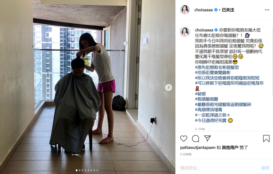 3月19日,阿Sa在个人社交网站晒出给助理剪头发的照